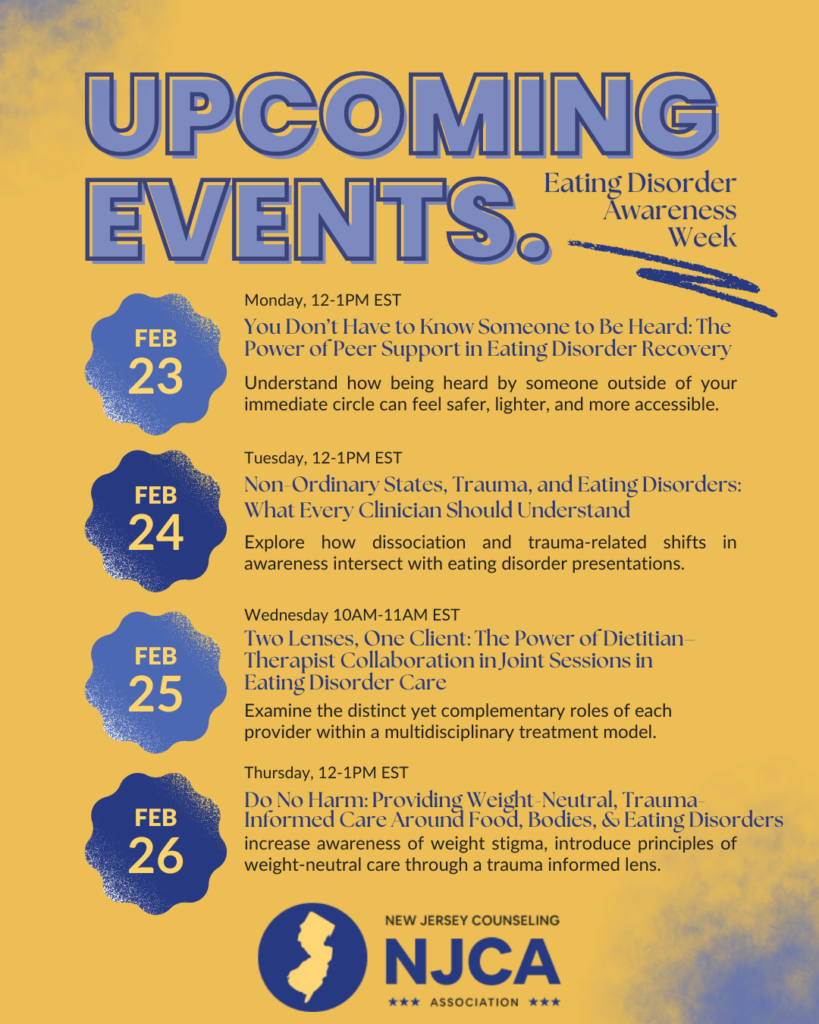 The New Jersey Counseling Association (NJCA) is the leading voice for professional counselors in the state. We are a community of Licensed Professional Counselors (LPCs), Licensed Associate Counselors (LACs), current and future counselor educators, counseling graduate students, affiliated agencies, and advocates of the field.