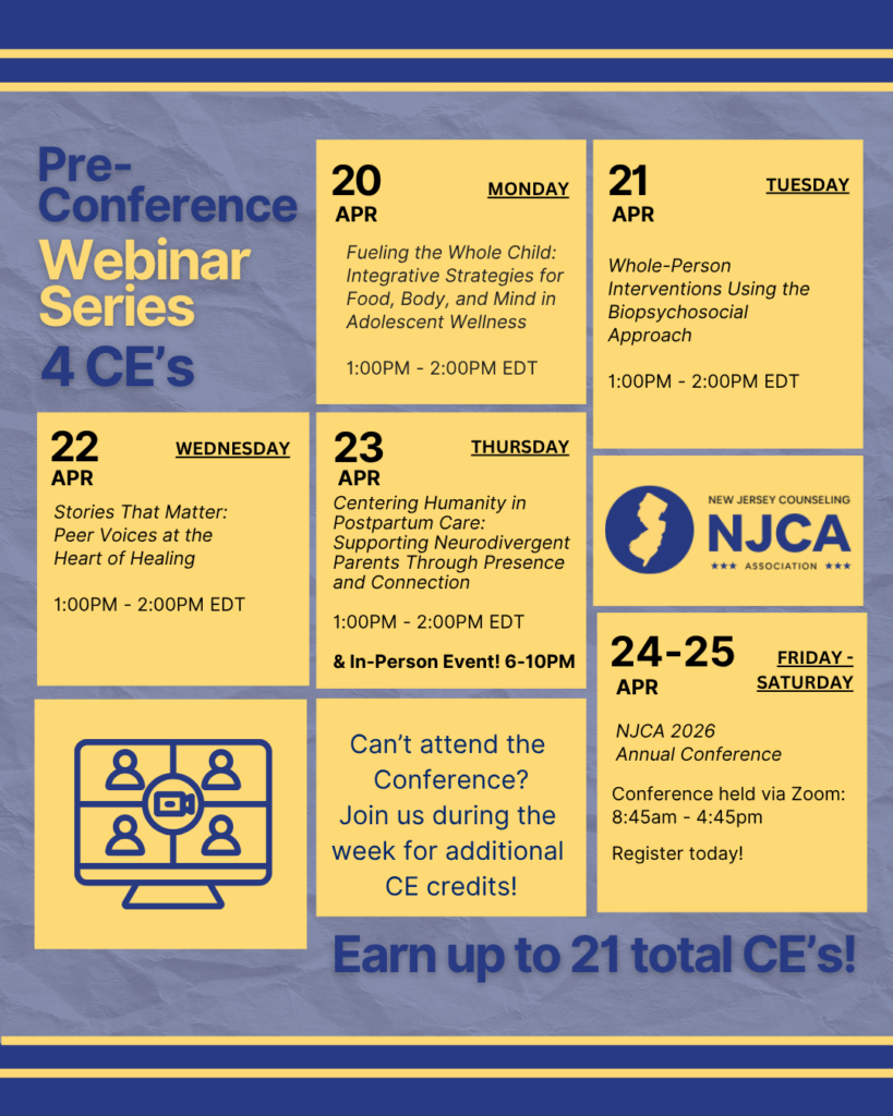 Discounts on NJCA’s annual conference where you’ll receive special workshops by counselors, counselor educators, and counseling students on evidence-based practices, social justice, and the latest innovative counseling news.